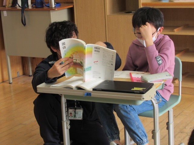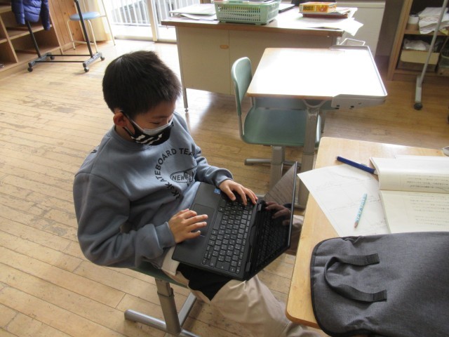 6年生の国語科、「考える」について書かれた3つの説明文を読み比べ、相違点や共通点を読み取り、自分の考えをまとめる学習の最中でした。3人の子供たちの学び方は三者三様。「考える」ことに向き合い、うーんと頭で考えて、自分の言葉でまとめてほしいと思います。「生みの苦しみ」は、達成感や自信につながっていきます。