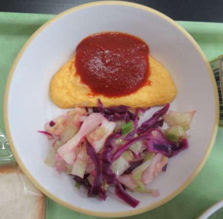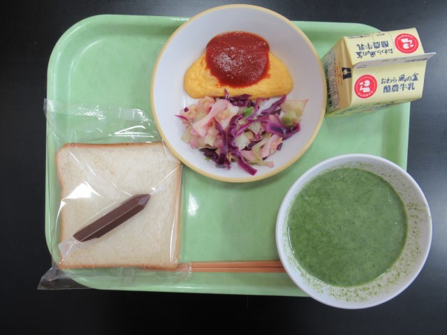 今日の給食は、赤に緑に黄色に紫と、とにかく色合いが鮮烈。ほうれん草ペーストが入ったの緑色のポタージュは、刻んだタマネギや角切りされたジャガイモが入っていて甘くておいしかったです。紫キャベツのマリネは、食べやすい優しいお酢で仕上げてありました。久々に食パンに添加物が付きました。それもチョコペン!食パンに模様や文字をかいたり、チョコペンと奮闘したりしている子供たちは生き生きしていました。