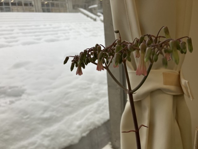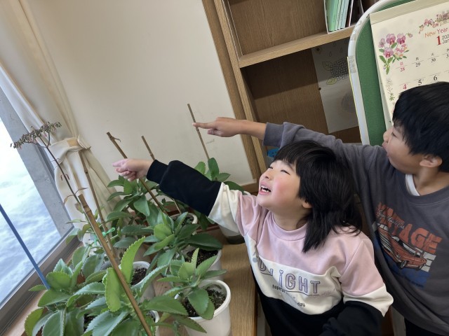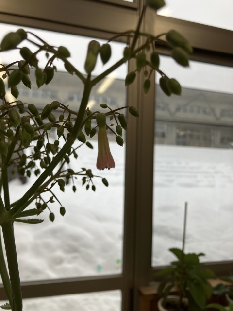 あおぞら級の卒業生から引き継いでお世話を続けている子宝草。なんと今朝教室に行くと、「先生!見て!花が咲いている!」と大喜びの子供たちです。ピンクのかわいい花が咲いていました。お世話を続けた甲斐がありました。冬の間も植物が大好きなあおぞら級です。