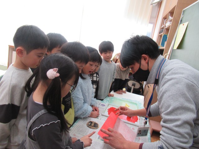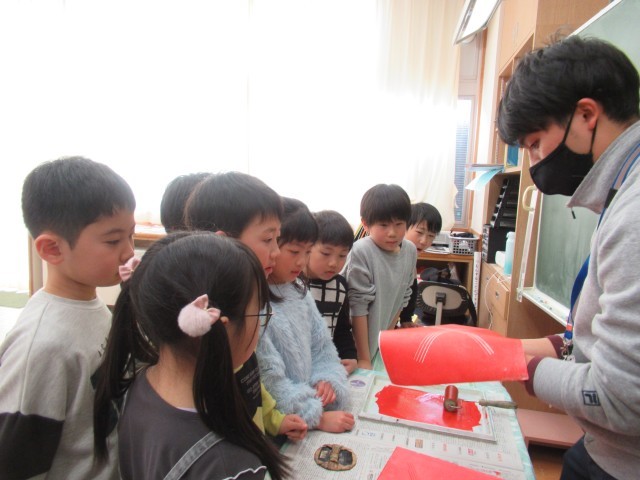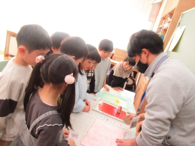 2年生は、ちょうど担任が版に色をのせて刷る手順を見ているところでした。バレンで丁寧にこすった後、紙をそうっとはがすと…。きれいな色と写し出された模様を見て、子供たちから「わぁ~」の歓声が上がりました。今度は、みんなの番です。