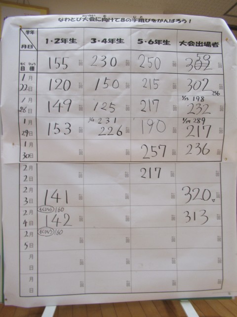 木曜朝のチャレンジタイム、今は大縄の8の字跳びに取り組んでいます。毎週記録を取り、回数の更新を目当てに励んでいます。立春を過ぎて暖かくなってきたというものの、体育館はまだまだ冷蔵庫内のような冷気が漂っています。そんな中、縄にひっかかる友達に「大丈夫、大丈夫だよ。」と声かけする子供の姿に、心が温かくなりました。