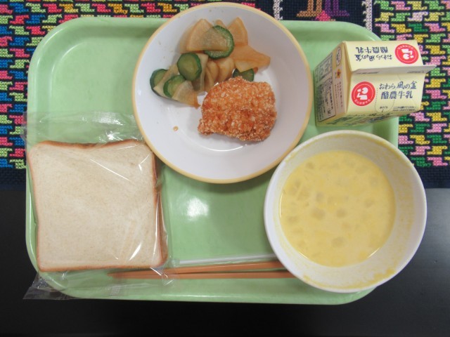 チキンフィレは、初めて給食に出たような気がします。食パンにはさみ、チキンフィレサンドにしました。おいしかったです。もう1枚の食パンは、ちぎってスープにひたしていただきました。こちらもおいしかったです。