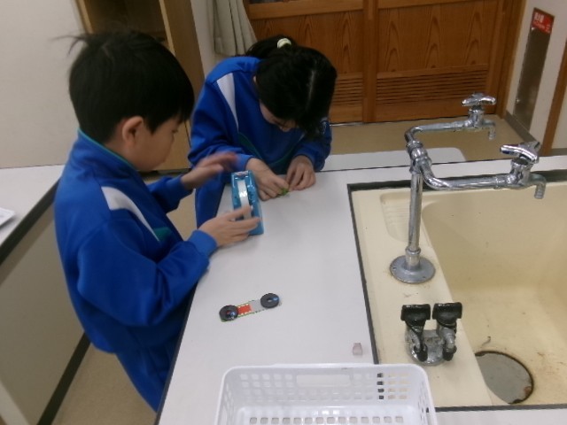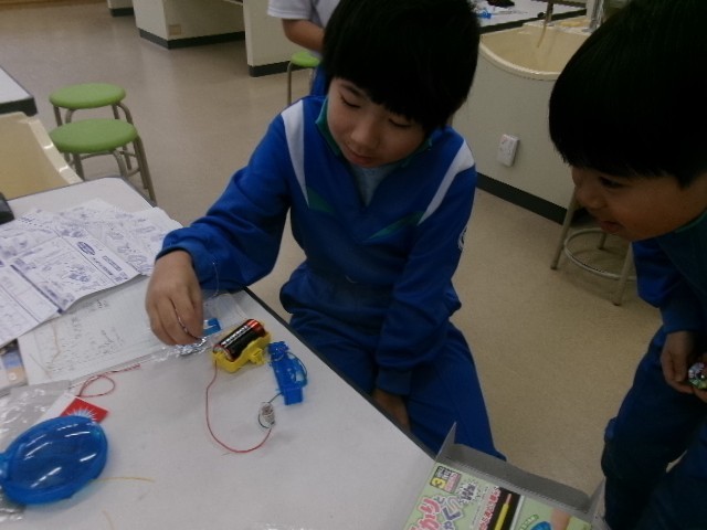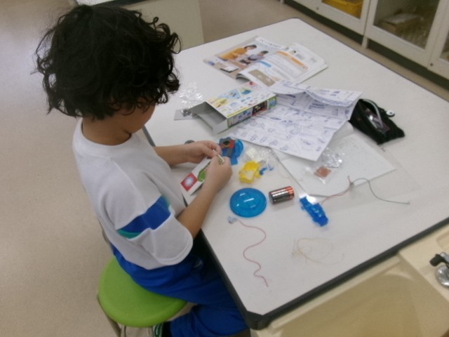 電気の通り道と磁石の性質について学習した子供たちは、学習キットを使って明かりがつくおもちゃと磁石のおもちゃをつくりました。学んだことを確認しながら、みんなでつくったおもちゃで遊びました。この後、学んだことを生かして、自分で考えたおもちゃづくりに取り組みます。どんなおもちゃができるか楽しみです!