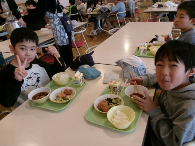 みんなに人気の照焼きチキンはおかわりもたくさんあって、ゲットできた子供たちはとても嬉しそうでした。煮物の中の人参と大根の紅白のハートがかわいかったです!