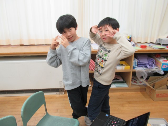 25日(木)に行われる「卒業を祝う集会」に向けて、2年生は、6年生クイズを制作中でした。一人一台端末を使って、友達と相談しながら工夫したスライドに仕上げていました。ふと見ると、6年生への感謝の思いを身体表現する二人の姿がありました。