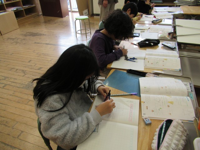 3年生の子供たちは、コンパスと定規を使って二等辺三角形の作図に夢中になって取り組んでいました。見守る2名の教員のもと、作図方法について確実に習得していました。