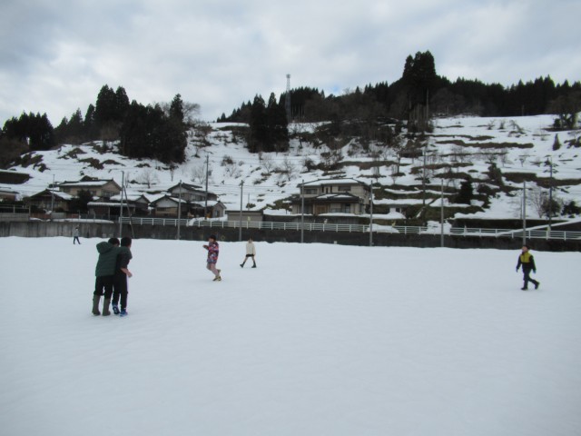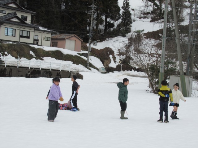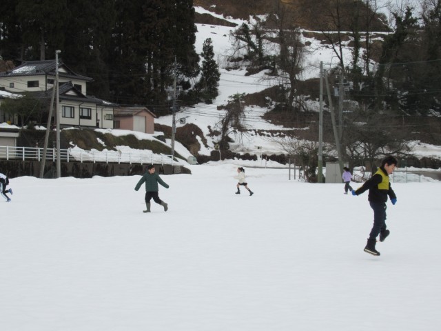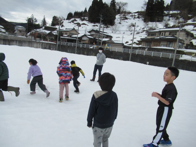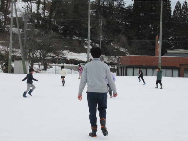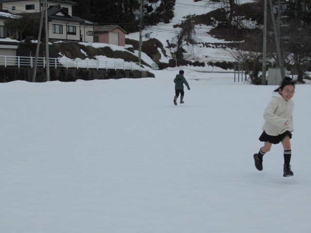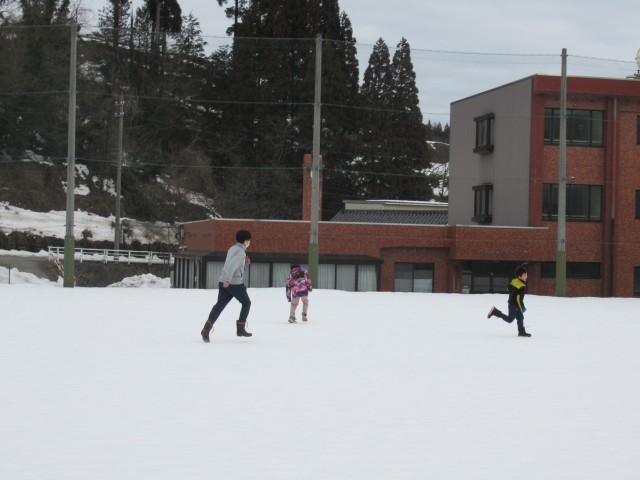 氷点下の寒い朝、私の体重で雪に乗っても沈まないことを発見。早速、子供たちにこの感動を伝えたくなり、2年生の子供たちに声をかけ、グラウンドに出ました。ある子供は、ちゃんと雪わたりのことを知っていて、犬の散歩中に田んぼに入っても沈まなかったことを教えてくれました。子供たちと教員で雪上おにごっこを短時間でしたが楽しみました。「雪解けて村いっぱいに子供かな」ではありませんが、グラウンドを駆け回る元気な子供たちの姿がまぶしかったです。日中の最高気温は11度とか、長靴がズボズボ雪に埋もれるのも時間の問題です。自然豊かな山田小で学ぶ楽しさを子供たちに感じ取ってほしいと願っています。