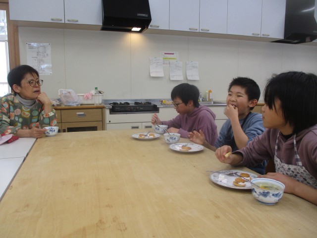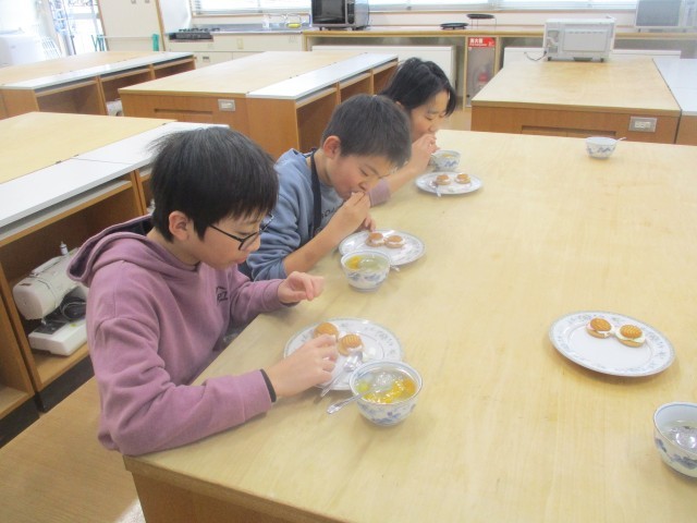 今日は、調理実習でした。子供たちが生活を豊かにし、楽しむという思いのもと、フルーツポンチとマシュマロをクッキーで挟んだクッキーマシュマロを作りました。協力して調理を進め、出来上がったデザートは格別でした。中学生への期待や楽しみも話し合って、楽しいひとときとなりました。