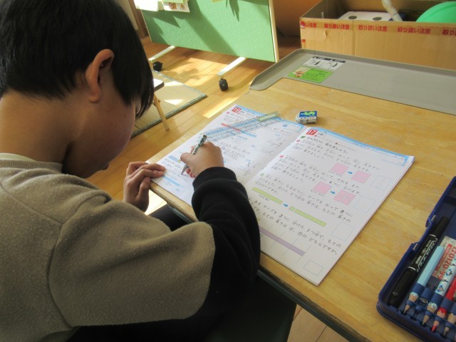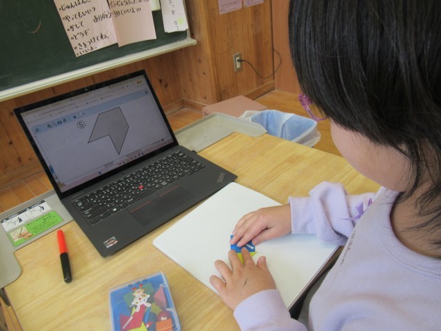 算数科の学習の様子です。2年生は「図をつかって考えよう」、1年生は「かたちづくり」の学習を行っています。学習の内容は違いますが、隣で頑張る友達の姿に背中を押され、難しい問題にも集中して取り組んでいます。