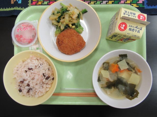 1、2限に「卒業を祝う集会」が行われました。給食のお祝いメニューと重なり、お祝いされる6年生も、祝う下級生も気持ちが盛り上がる給食になりました。