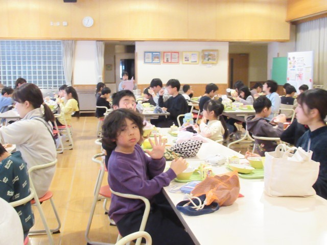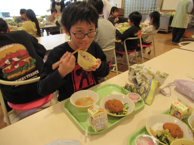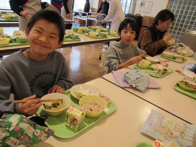 お祝いされる6年生もお祝いする下級生もみんな、おいしい給食に笑顔です。