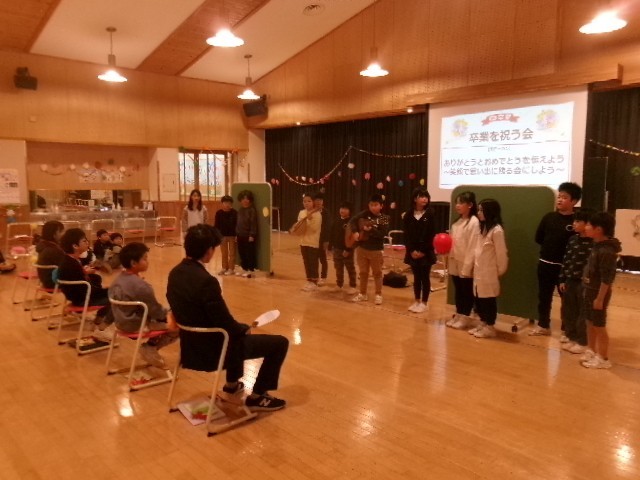 卒業を祝う会の出し物で、6年生との思い出を振り返りました。