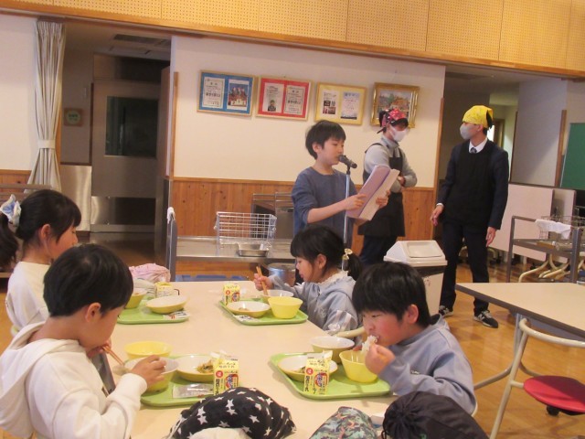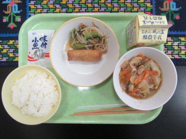 春巻きの皮がパリッパリ、中身はふんわり餡で、何本でもいけそうでした。八宝菜は、たっぷり野菜、干ししいたけ、豚肉からの旨味が出ていて、おいしかったです。香味和えも焦がしネギの風味がきいていて、さっぱりといただけました。令和7年度の最後を飾る素晴らしい給食でした。調理員さん、栄養士さん、一年間、真心のこもったおいしい給食をつくってくださり、ありがとうございました。毎日、給食の時間が楽しみでした。