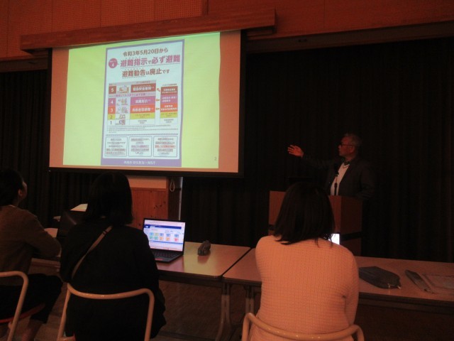 山田地域自治振興会会長の山田様、山田地域自主防災組織連絡協議会副会長の松本様をお招きして、山田小・中学校教職員で合同防災研修会を行いました。気象警報の名称、基準の変更等、最新の情報やハザードマップポータルサイトの使い方等を教えていただきました。