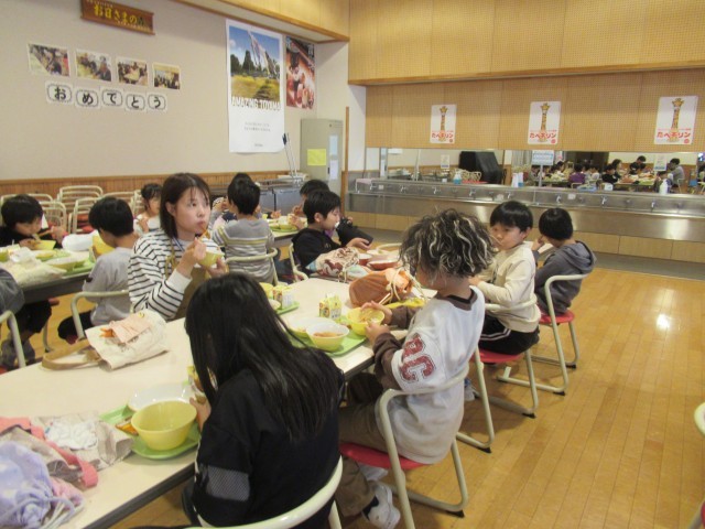 ランチルームでの食事風景。昨年度と大きく変わった点があります。お気付きでしょうか。そうなんです!中学校の生徒や先生方もランチルームを利用されることになりました。コロナ禍前に戻ったとか…。流れる空気が変わりました。