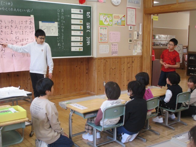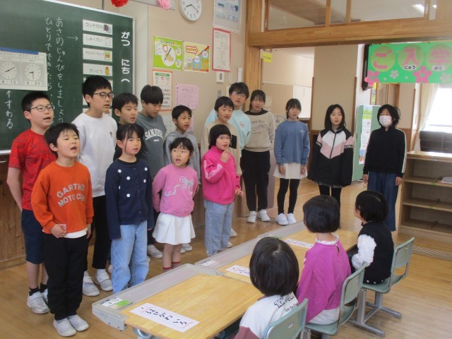 朝活動の時間に1年生教室へ行き、一緒に校歌を歌いました。校歌の歌詞の意味も1年生に分かってもらえるように、上手に説明していました。