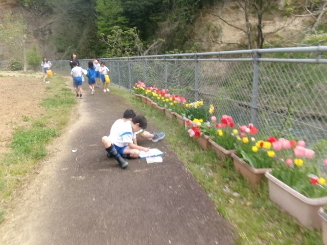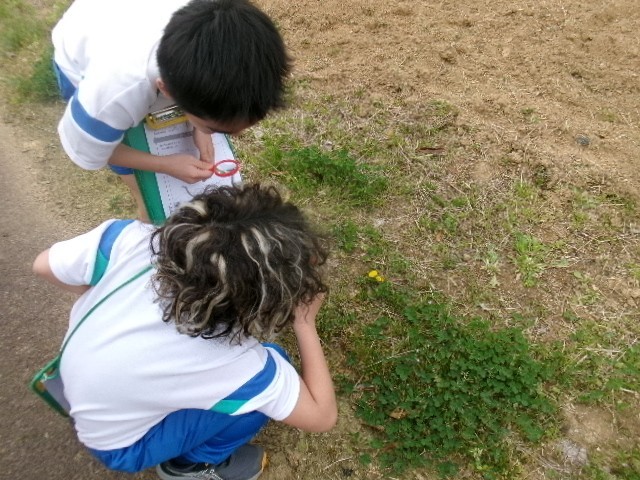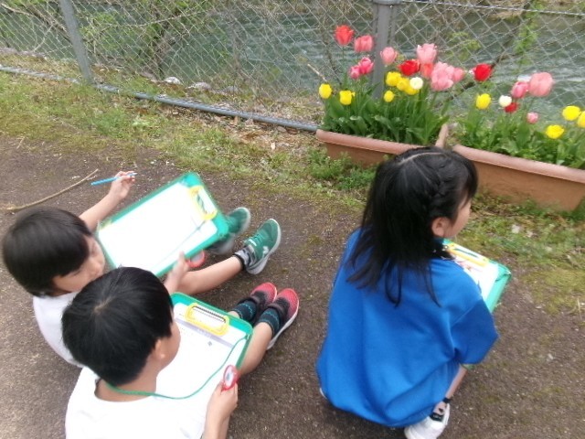 たんぽぽやチューリップ等、春らしいものを見つけて「たくさん咲いてる!」「これを観察しよう!」と楽しんで観察する様子が見られました。