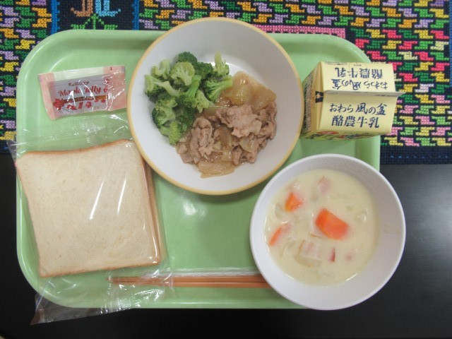 食パンに久しぶりに添加物、メープルジャムが付きました。みみまで柔らかいおいしい食パンがさらにおいしくなりました。牛乳との相性が、ばっちりでした。ゆでブロッコリーとポークソテーを絡めて食べてもおいしかったし、クリームシチューはベーコンや野菜の旨みが溶け出し、この上ないおいしさでした。幸せな給食に感謝。