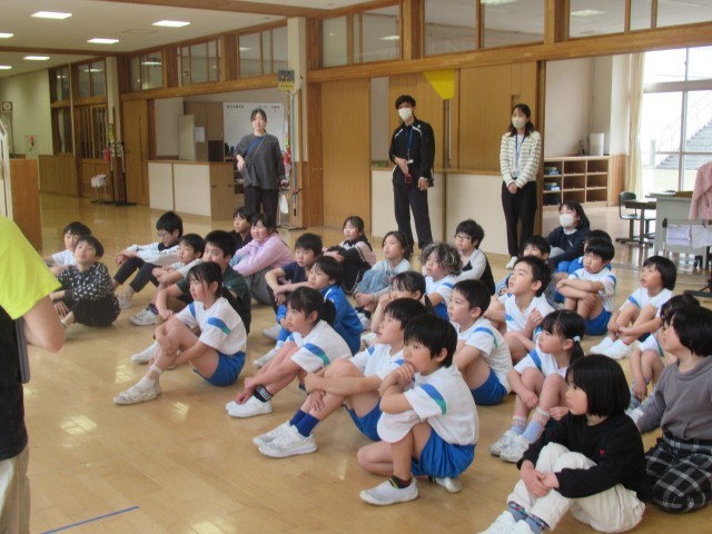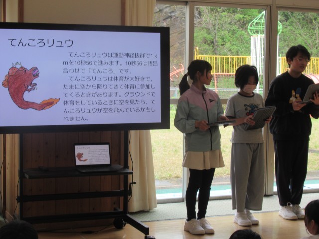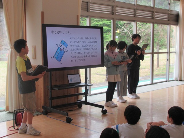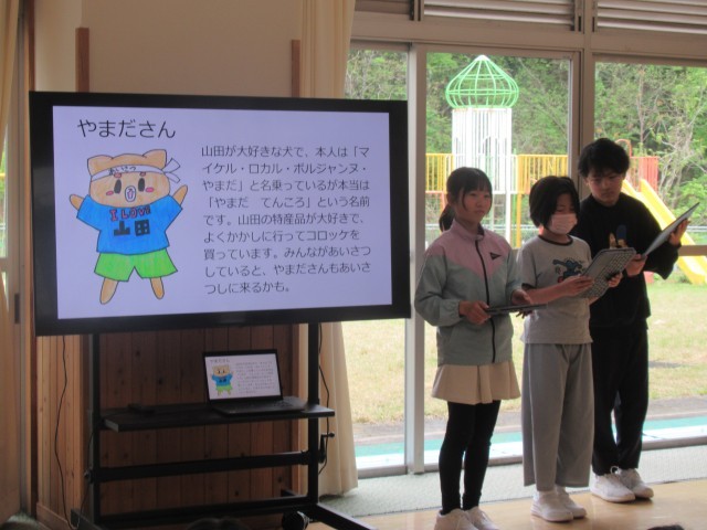 令和8年度児童会キャラクターの紹介が行われました。児童全員、教職員が投票して決定した今年度のキャラクターは、「ものさしくん」「やまださん」「てんころりゅう」です。それぞれのキャラクターには、発案者の思いや願いが込められていて、優しさ、地域愛、自分を高めようとする強さを感じました。3キャラクターも、40人の子供たちとともに一年をスタートしました。