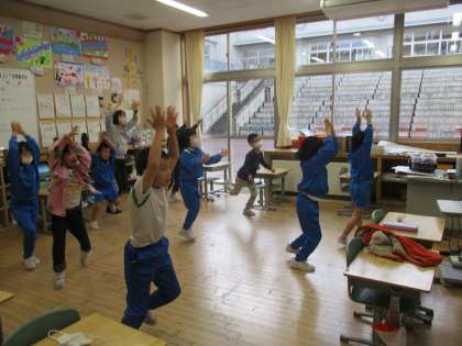 朝の音楽タイムには、各学年で歌ったり、楽器を弾いたりいろいろな活動をしています。2年生は音楽に合わせてダンスをしました。曲に合わせて体を動かし、元気いっぱい、笑顔いっぱいの2年生です。