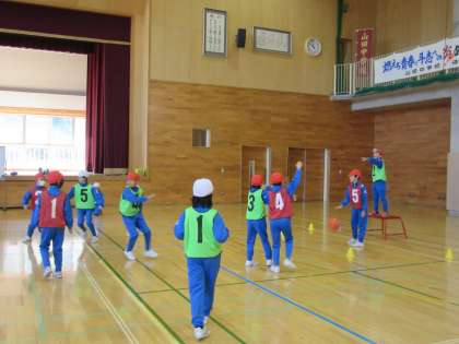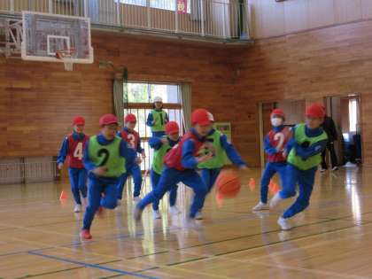 4つのチームに分かれて、ゲームをしました。声を掛け合い、パスを出したり、ドリブルをしたりしてゴール下まで進んでシュートします。ナイスプレーを褒めたり、別のチームの攻撃の仕方を見ながら、自分のチームの攻撃に生かそうとしたりして楽しんでいます。