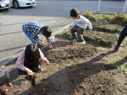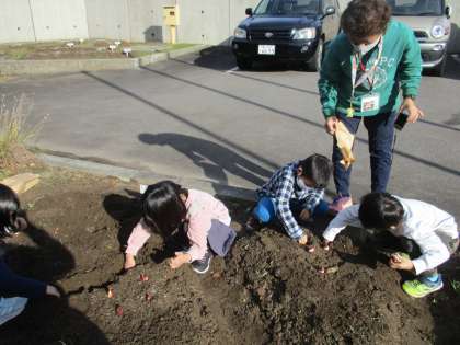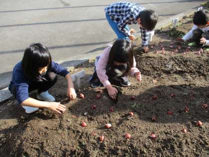 これから積もる雪の冷たさに耐え、春になったらきれいな色の花を咲かせるのが楽しみです。1年生が植えた球根からは黄色と赤色のチューリップが咲く予定です。