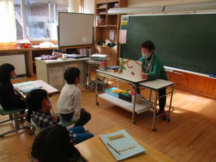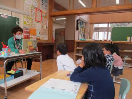国語の学習で、読書を進んで行う1年生。担任の先生による読み聞かせも大好きです。紙芝居にも夢中になり、身を乗り出して聞きました。