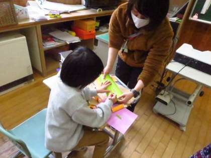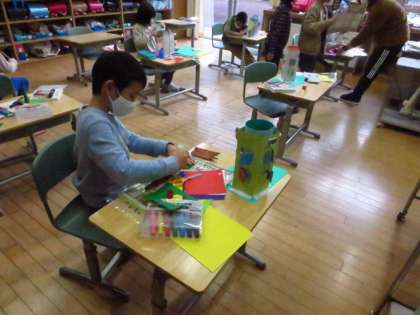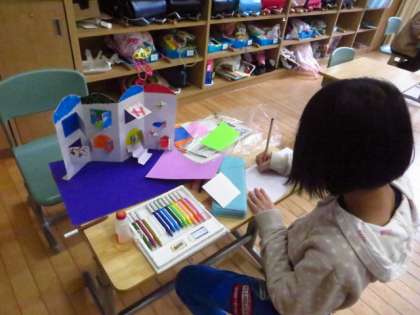 2年生の図画工作は、立体工作に挑戦しています。カッターを上手に使って窓を作り、その窓を開けると不思議な世界が広がるように工夫して作品を創り上げていました。