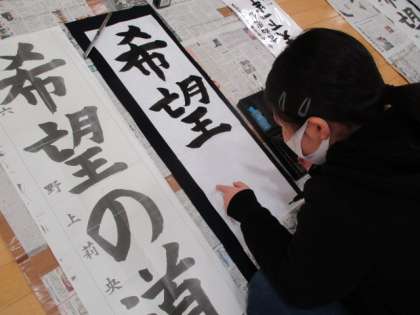 今年度の6年生の課題は「希望の道」です。字形やバランスに気を付けながら、大きくのびとびとした字が書けるように練習しています。