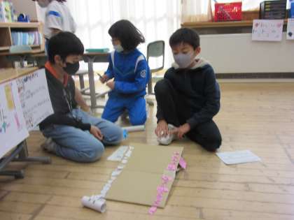 「作ったおもちゃでまつりを開いて、みんなを招待したい!」という子供たちの発言から、全校を招待して、おもちゃまつりを開きました。生活科の時間に試行錯誤し、一生懸命に作ったおもちゃで遊んでもらい、「いっぱいお客さんが来てくれたよ!」「おもしろいって言ってもらえたよ!」と、どの子も満足のいく時間となったようです。