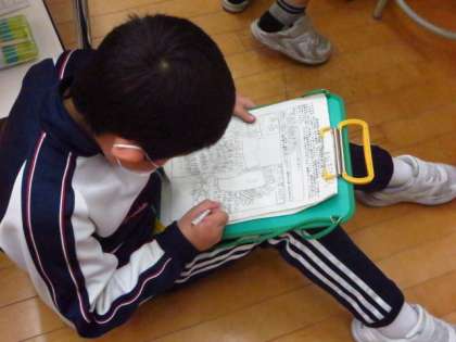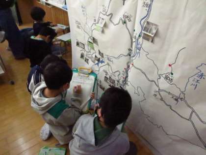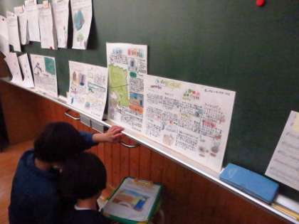 3年生の総合的な学習の時間は、山田地域の宝を見つける学習に取り組んでいます。この日は、これまで自分たちが調べてきたことをまとめる活動でしたが、みんな文字や絵を丁寧に書いていました。