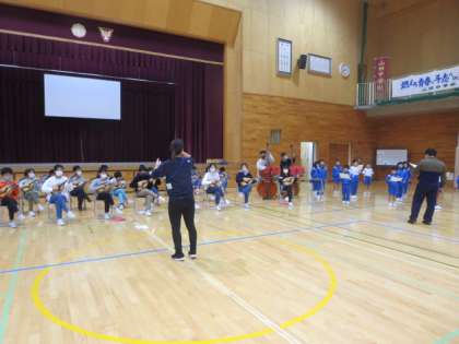 4日の朝、6年生マンドリン引退コンサートの全体練習を行いました。「カントリーロード」の曲を、4年生から6年生がマンドリン演奏をし、1年生から3年生が元気に歌いました。本番は、9日13時40分からです。都合のつくご家族の方は、ぜひ、ご来校ください。