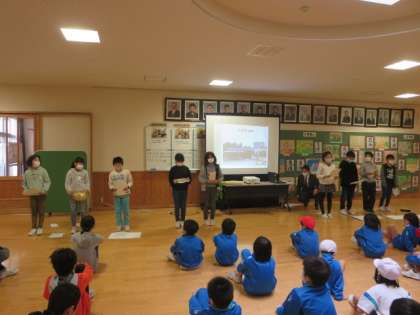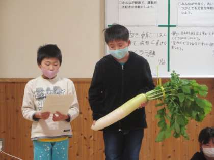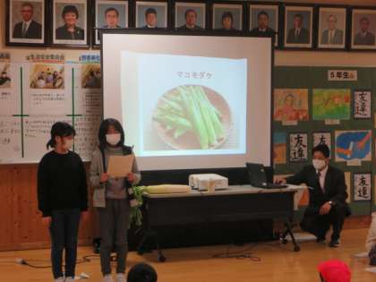 4日は、学校給食やまだの日です。この日は、地域でとれる食材を使って、5年生が考えて献立された給食を食べます。長休みには、5年生が、総合的な学習の時間に調べてきた地域の食材について全校に発表しました。5年生さんのおかげで、給食が楽しみになりました。