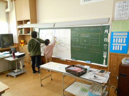2年生は、自分の住む地域のすてきなもの、人、場所等について、紹介カードにまとめて、大きな山田地域の白地図に貼り出す学習に取り組みました。