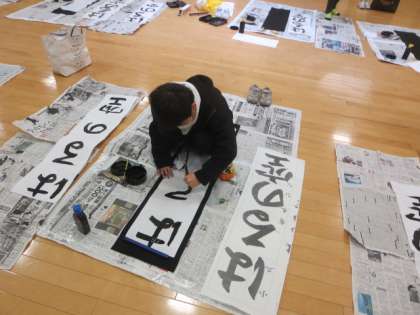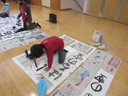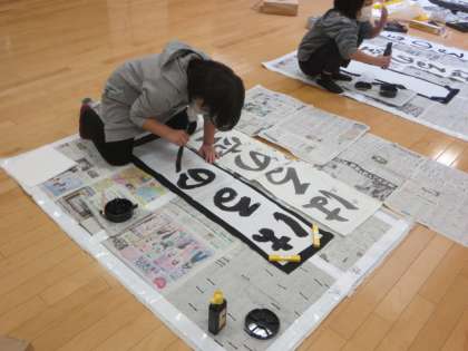 3年生の書き初めは、今年度からだるま筆で大きな習字紙に書きます。はじめは戸惑っていた子供たちですが、だんだん慣れてきて、力強く筆を動かすことができるようになってきました。