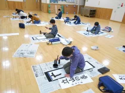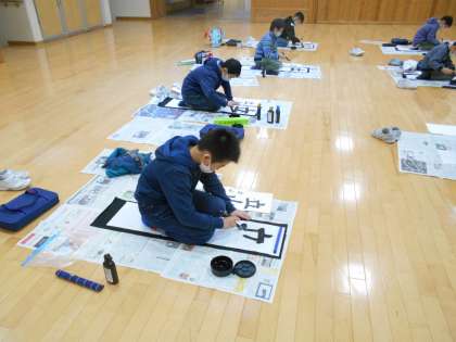 4年生は、書き初めの練習に取り組みました。墨のつけ方や筆を動かす向きに気を付けて慎重に揮毫していました。