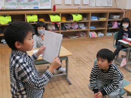 国語の学習で、「日づけとよう日」の学習をしました。音読練習を続けてきたおかげで見なくても読めるようになりました。本日は、自分の考えた「よう日」を発表し合いました。一人一人、オリジナルの詩を読み、それぞれの詩を楽しみました。