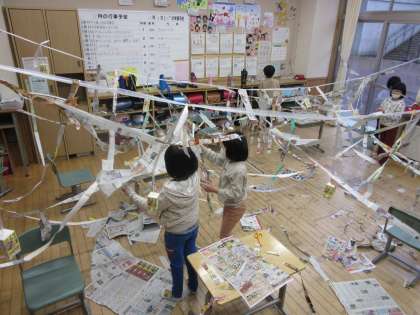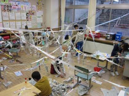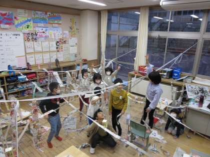 図画工作科の「つないでつるして」の学習で、教室いっぱいに作品を広げました。「ここは蜘蛛の巣で、宝があるんだよ」「ここを色画用紙でかわりばんこに繋げたらいいんじゃない」と大盛り上がりの2時間でした。