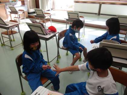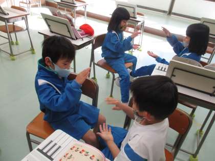 音楽の学習で、日本の歌を歌っています。本日は、「おちゃらかほい」を歌いました。だんだん楽しくなってきて、手遊びも行いながら歌いました。「勝ったよ」「負けたよ」「あいこで」とそれぞれのポーズをしながら延々と続きました。