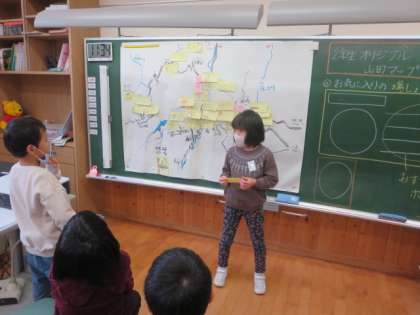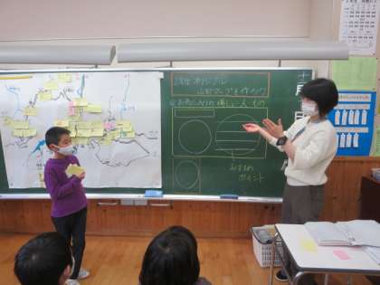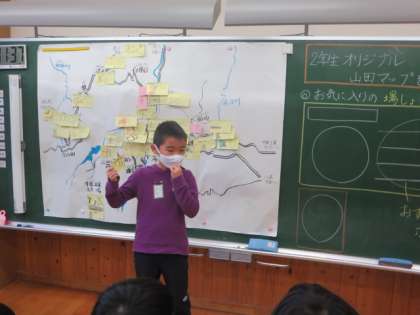 2年生は、山田地域を探検した学習のまとめとしてオリジナル山田マップをつくりました。この日は、子供たちが調べたお勧めの場所をみんなに紹介したり、友達の質問に答えたりしていました。