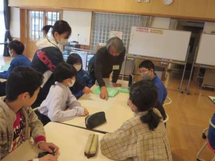 山田小中学校の特色の一つ。6年生と中学1年生とで、総合的な学習の時間を行います。今年度のテーマは「山田地域の自然」です。2つの学年が、4つに分かれてグループ学習を行います。この日は、グループ毎に取り組んでみたいテーマを決めました。