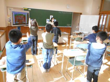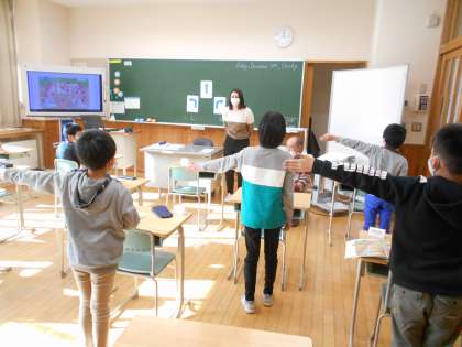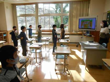 4年生は、外国語活動の学習で、道案内をテーマに「真っ直ぐに、右に、左に」と指示をすることを学びました。