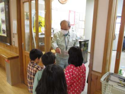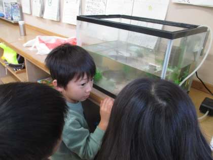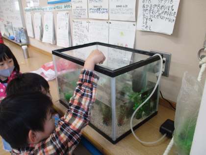 今朝、用務員さんが家で飼っていた金魚を1年生教室に持ってきてくださいました。長年飼っていて、フナのように大きくなったそうです。子供たちは、えさのやり方等を用務員さんに聞き、興味津々で世話をしていました。