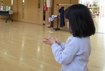 生活科の時間に、昔の遊びに挑戦しています。この日は、竹とんぼ遊びに取り組みました。アイスクリームのスプーンと竹ぐしで簡単な竹とんぼを作り、飛ばして遊びました。