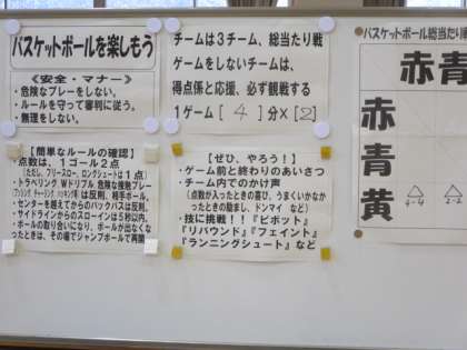 6年生の体育は、バスケットボールの学習に取り組んでいます。先月行っていたバスケットボールより、チームの仲間ともっと協力できるようにルールを工夫しました。この日も、仲間と声を掛け合う姿がたくさん見られました。