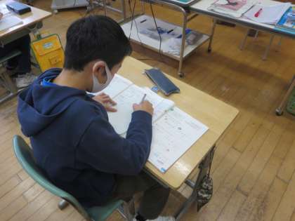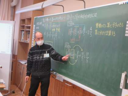 4年生の算数は、分数のたし算の学習を行っています。この日は、帯分数のままで計算するのと仮分数に直して計算するのとでは、どちらが計算しやすいかについて話し合っていました。
