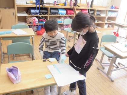16日に作り上げたオリジナル物語を友達同士で読み合いました。よかったところや感想を付箋に書いて友達に渡していました。