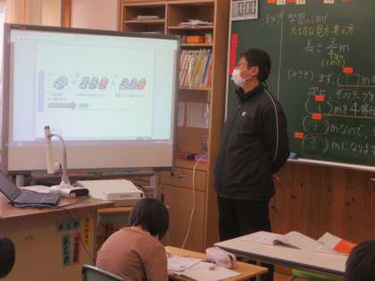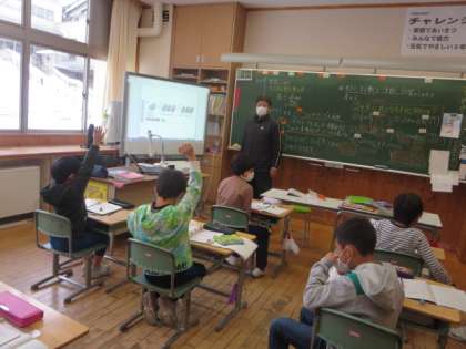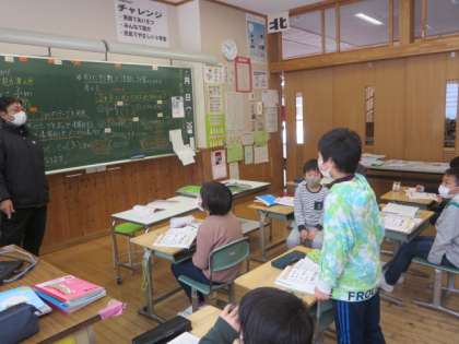 3年生の算数は2学期のまとめの学習に取り組んでいます。この日は、お話や場面を式に表しました。子供たちは「分かった」「できた」と張り切って発言していました。