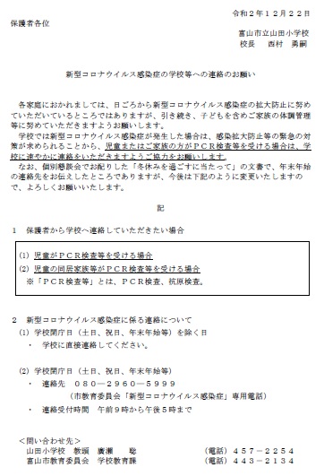新型コロナウイルス感染症の学校等への連絡のお願い :12月22日(火)