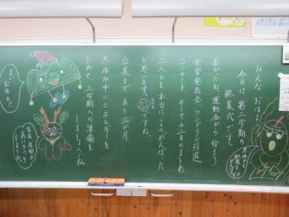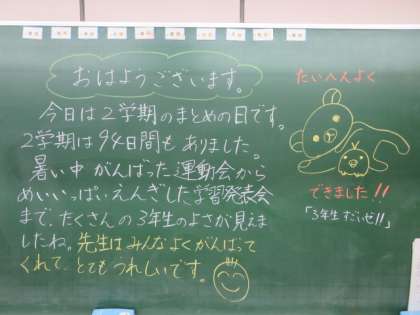本日は終業式。学校に来てみると、各教室の黒板には、担任の先生から、がんばって2学期を過ごした子供たちへメッセージが書かれてありました。